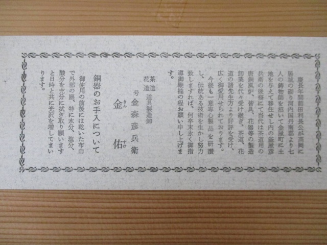 木箱には「釜 畠春斎作」と書かれていて、畠春斎は高岡銅器の産地である富山県高岡市で代々続く著名な釜師の家系で、茶道工芸において非常に評価が高い名匠です(*゚0゚*)
